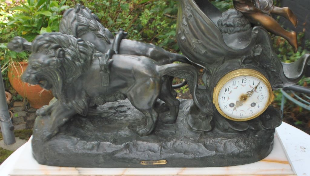 Riesige französische Kaminuhr, 19. Jahrhundert. Char de la Concorde. Nike – die personifizierte Siegesgöttin. Zinkuhr auf Marmorsockel. Nike auf einem von Löwen gezogenen Streitwagen. Die Figuren sind bronziert.