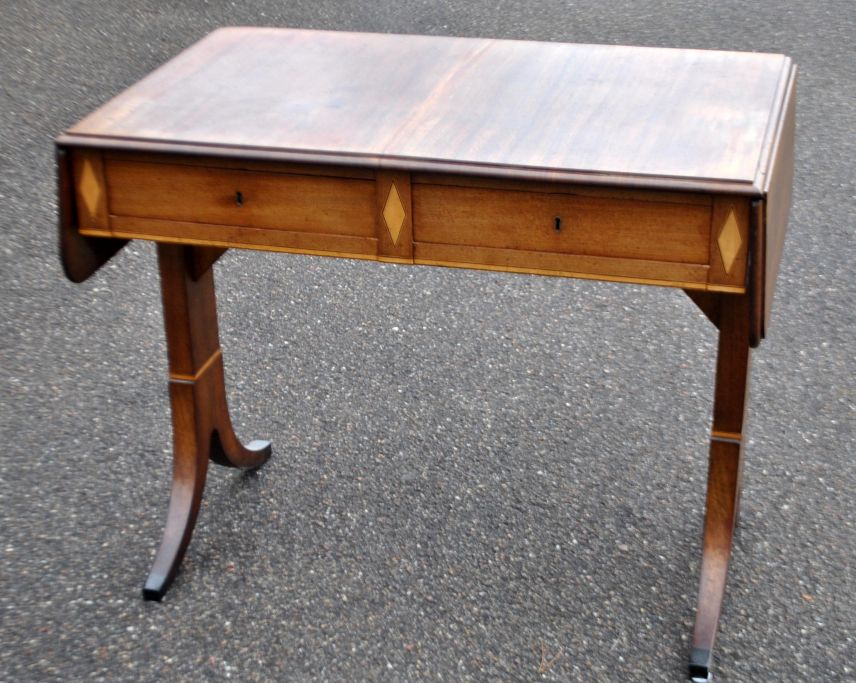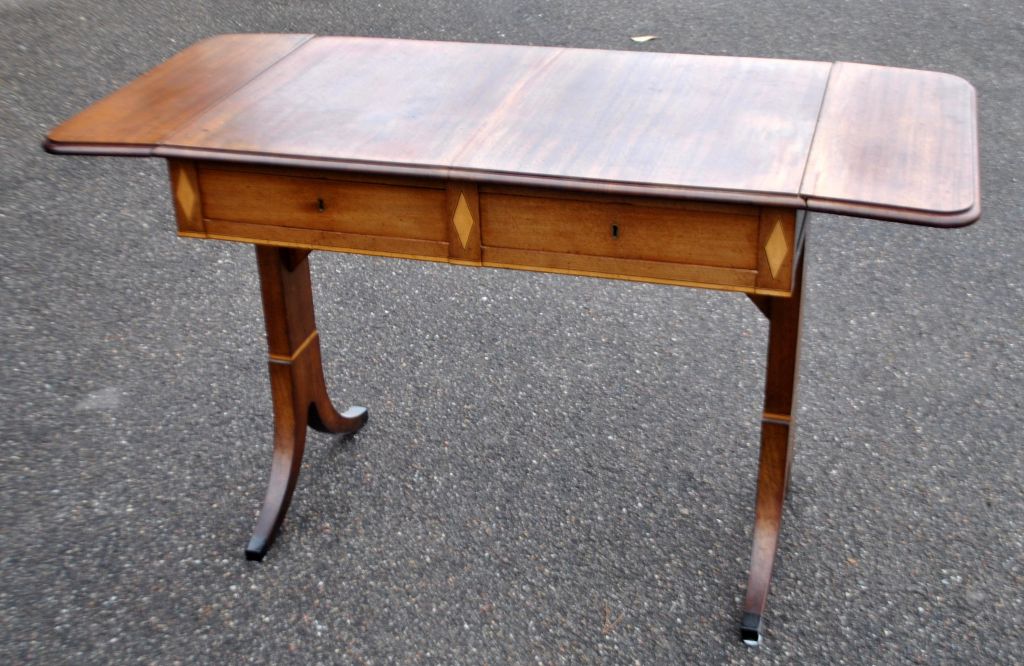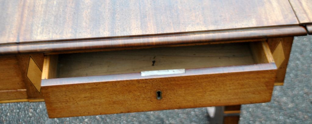 Arbeitstisch mit Klappen aus Mahagoni mit Intarsien, um 1900. Dänemark. Empire-Stil. Mit Schublade. L: 88 cm. B: 58 cm. H: 77 cm. Länge ausgeklappt: 132 cm.