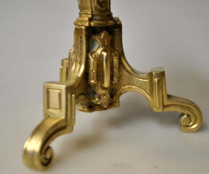 Paar französische Bronzeleuchter, 19. Jahrhundert. Mit gesichtsförmigen Verzierungen. Auf drei Beinen. Höhe: 17 cm.