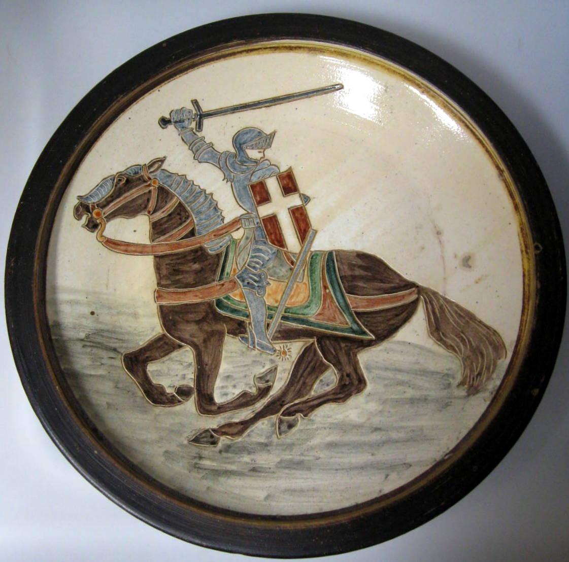 Obstteller aus bemaltes Lehm mit Ritter in Rüstung, Munk, Holte, Dänemark. Signiert: Munk, Holte-Nr. 27. Entwurf im nassen Lehm eingeschnitten. Später handbemalt. Dia:. 38 cm.